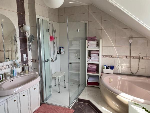 Ca. 180 m² Wohnfläche aufgeteilt auf Erdgeschoss und Obergeschoss, Kellerfläche ca. 90 m² mit Infrarotkabine und Erlebnisdusche.